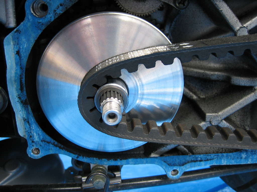 A V-belt is a rubber belt used for driving mechanisms in an engine such as the fans or water pump. A V-belt must be the right size, extending slightly out of the pulley groove. The V-belt has driven mechanical parts of car engines since the 1920s.